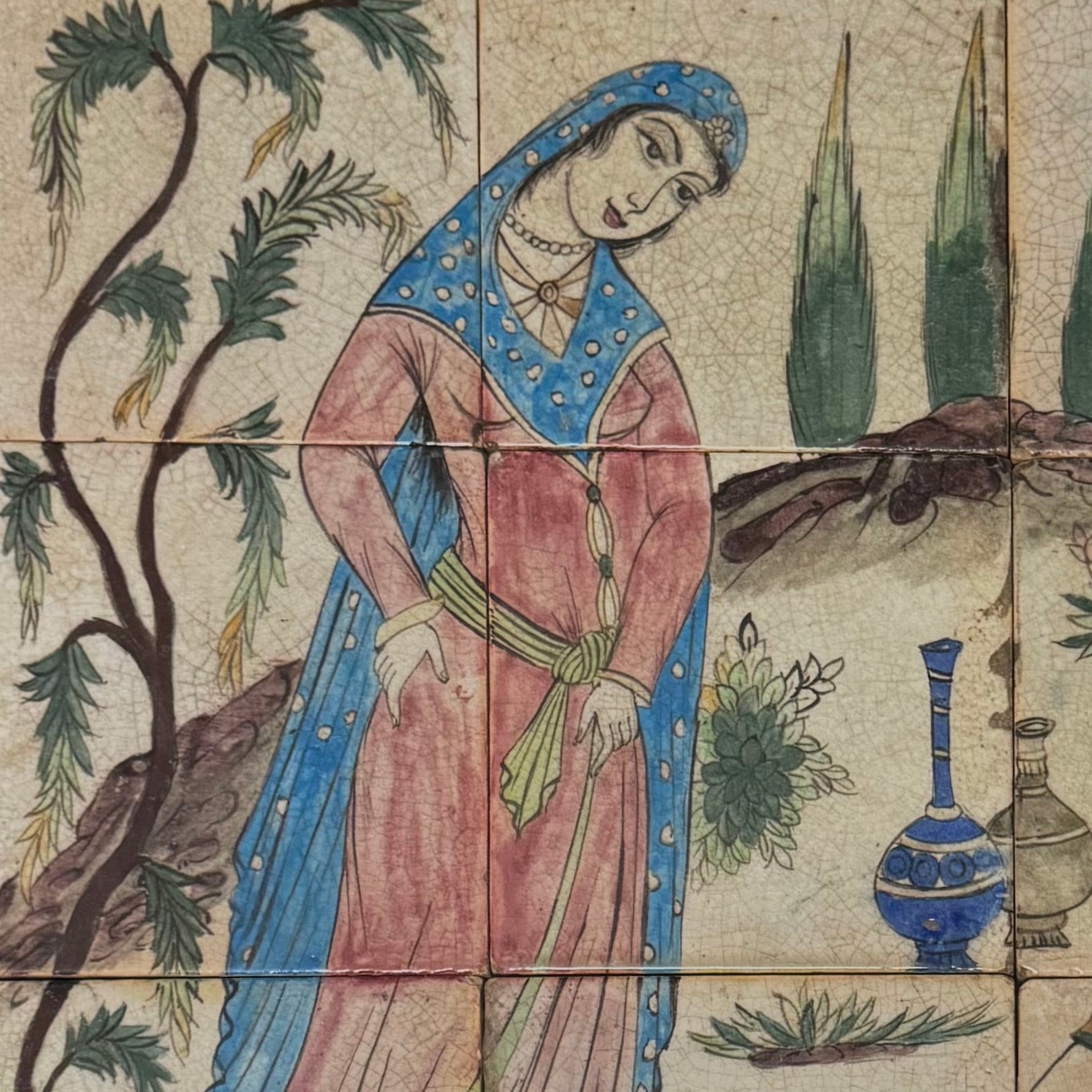 This rare 12-tile set goes beyond typical examples in both scale and artistry. It preserves the courtly ideals of beauty, power, and sophistication of 19th-century Iran while standing as a museum-worthy testament to Persian craftsmanship at its zenith.