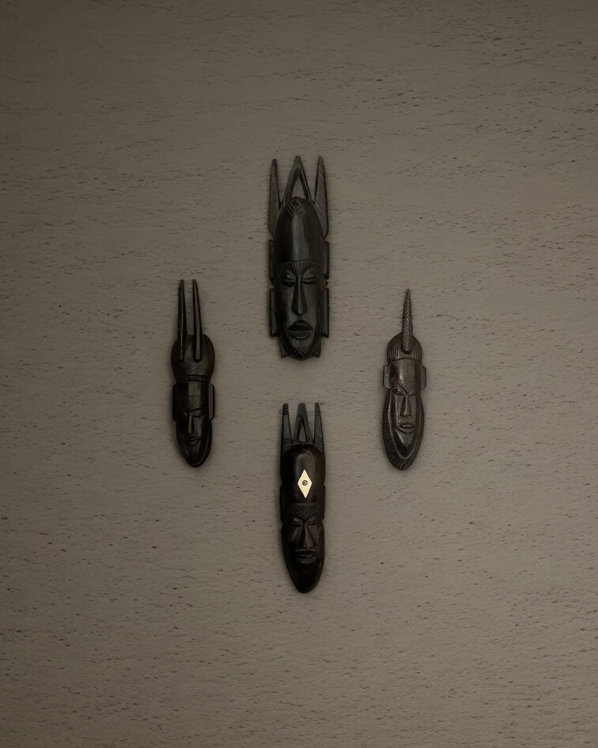 Set of four hand-carved African masks crafted from dense ebony, with one featuring an elegant bone inlay. The pieces complement each other beautifully, making an exceptional and cohesive set.
