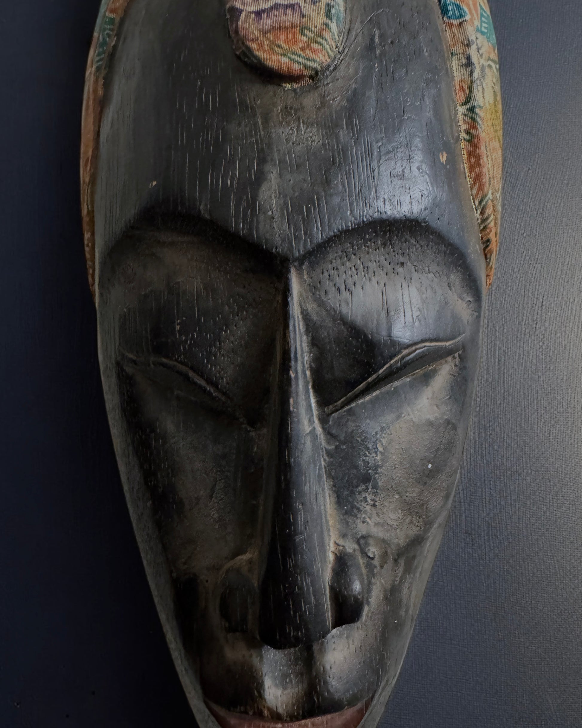 Hand-carved African ceremonial mask crafted from wood, featuring fabric details on the forehead. An unusual piece with a rich patina, adding to its character.