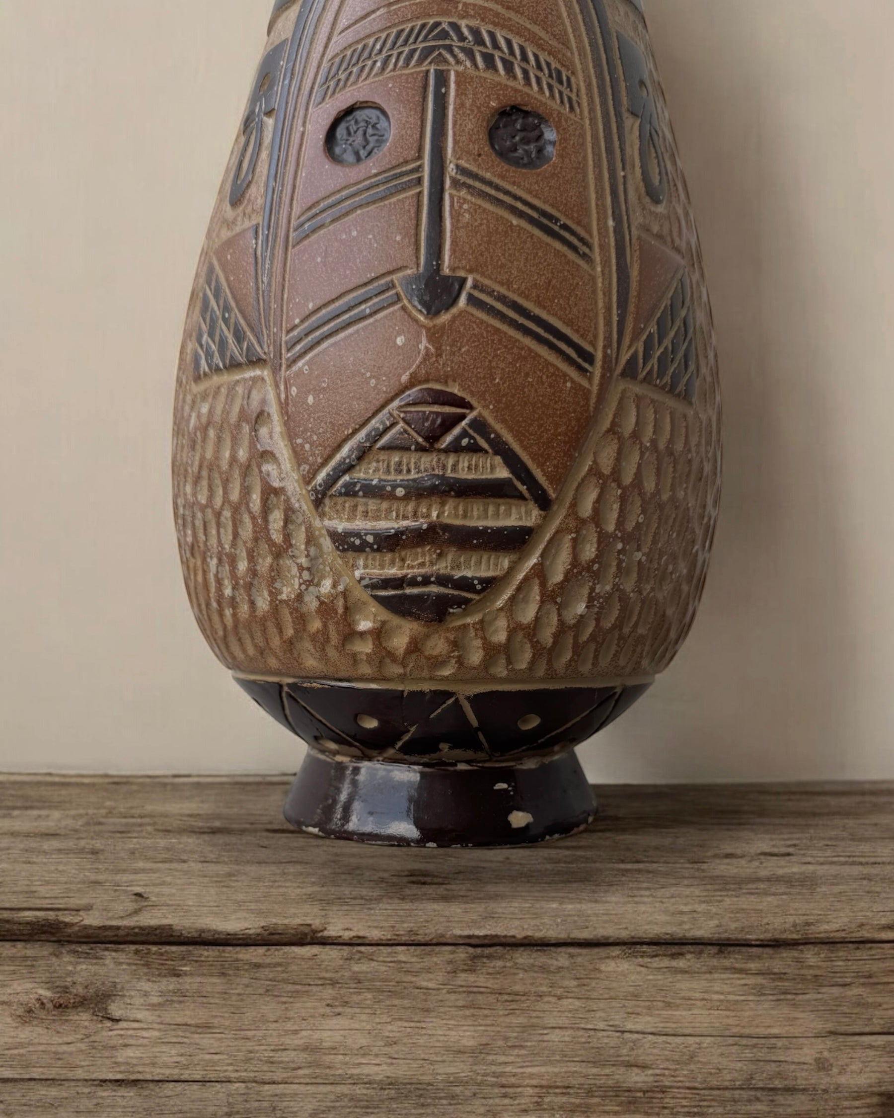African tribal-style terracotta vase, detailed with hand carved and painted design. Its earthy tones and natural finish give it a striking presence, full of character and charm. A beautiful, unusual and very decorative piece.