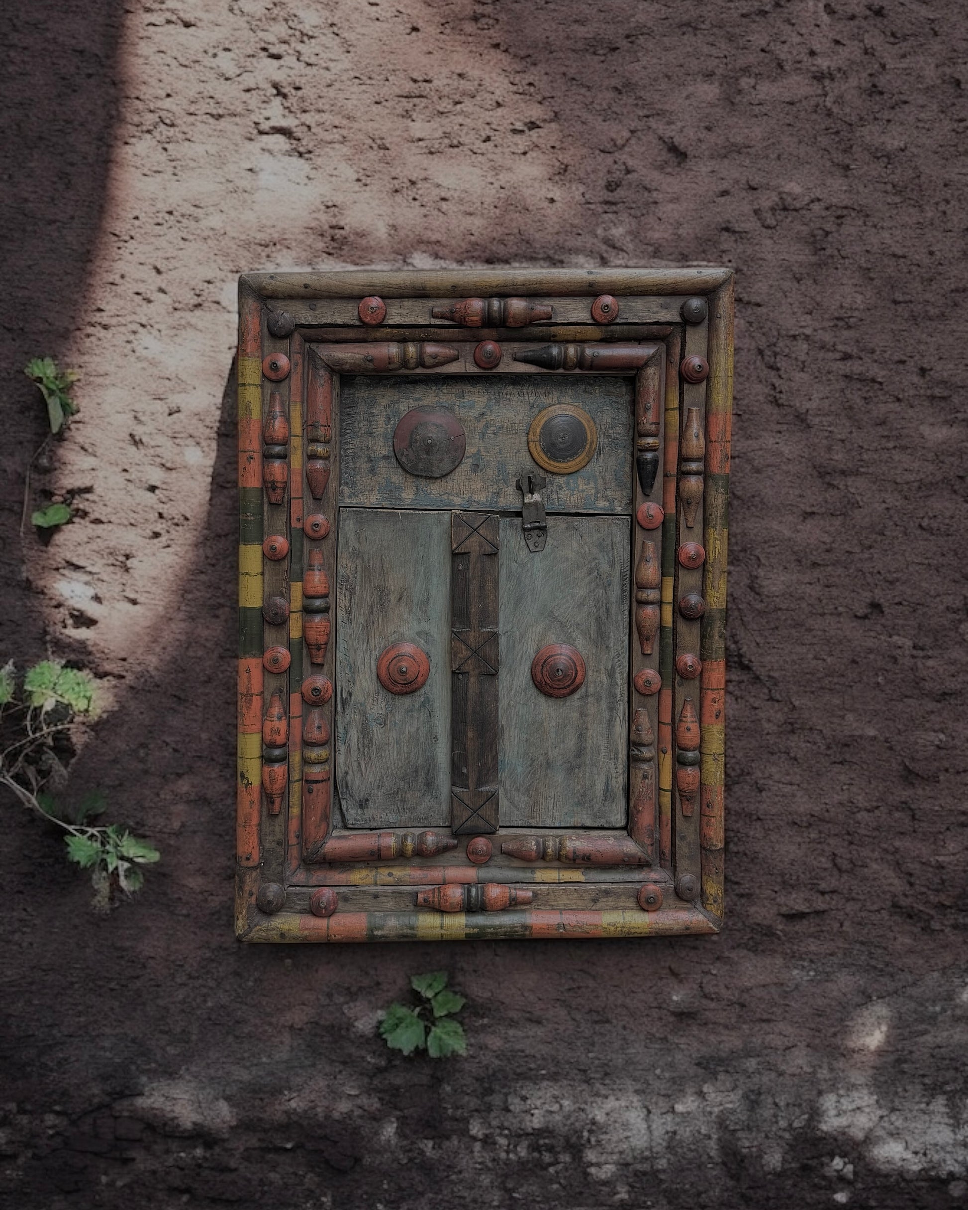 Antique Indian wooden door, likely originating from Rajasthan in early 20th century . This beautifully crafted piece features intricate hand-carving and original hand-painted details. Compact in size and full of character, it makes a striking wall hanging or can be creatively repurposed as a unique mirror frame. A versatile and decorative accent with rich cultural charm.