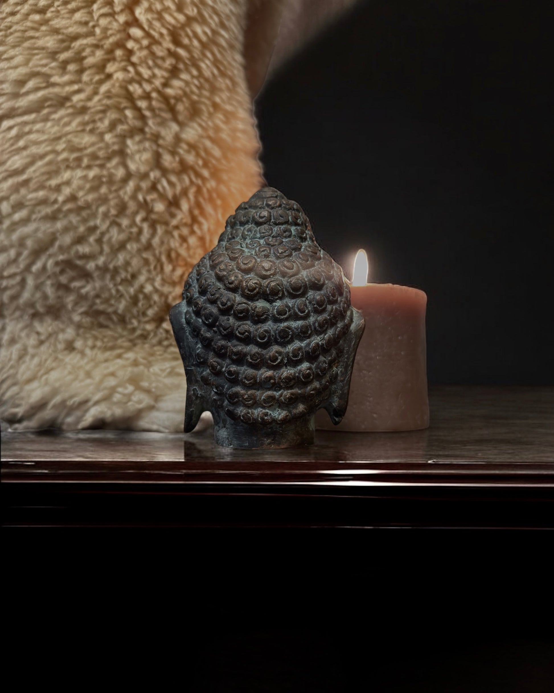 A finely crafted Burmese bronze Buddha head with a high copper content, displaying a beautiful patina that attests to its age and authenticity. The Buddha’s serene expression, with softly closed eyes and a gentle smile, radiates calm and compassion. Though its exact age is unknown, this piece carries a timeless presence and quiet beauty.