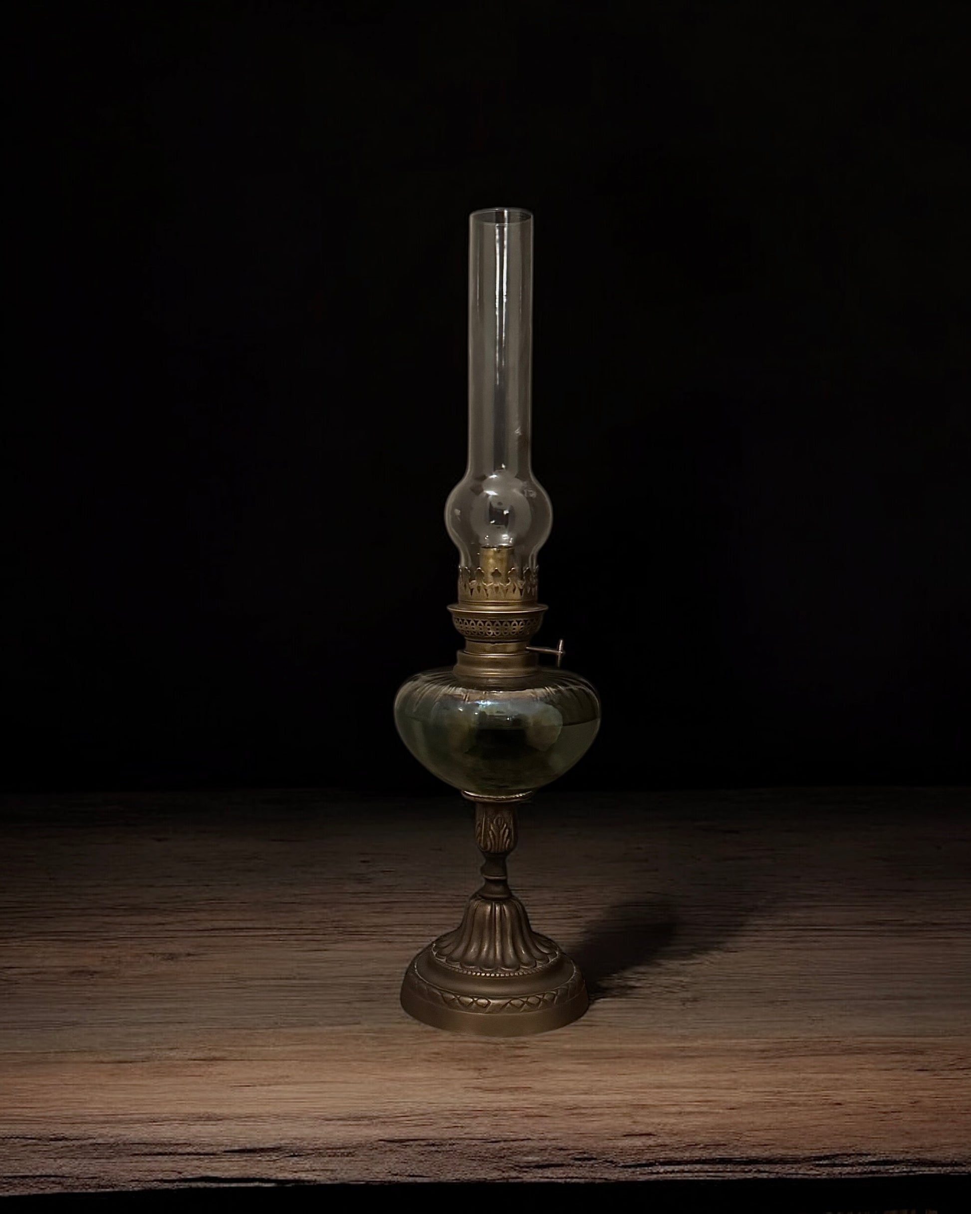 An elegant example of early 1900s British lighting, featuring a beautiful tinted glass oil tank paired with a finely cast brass base and burner. The lamp is fitted with a round wick and topped with a tall, narrow glass chimney, giving it both functionality and refined character. A fine decorative and collectible piece of vintage British craftsmanship.