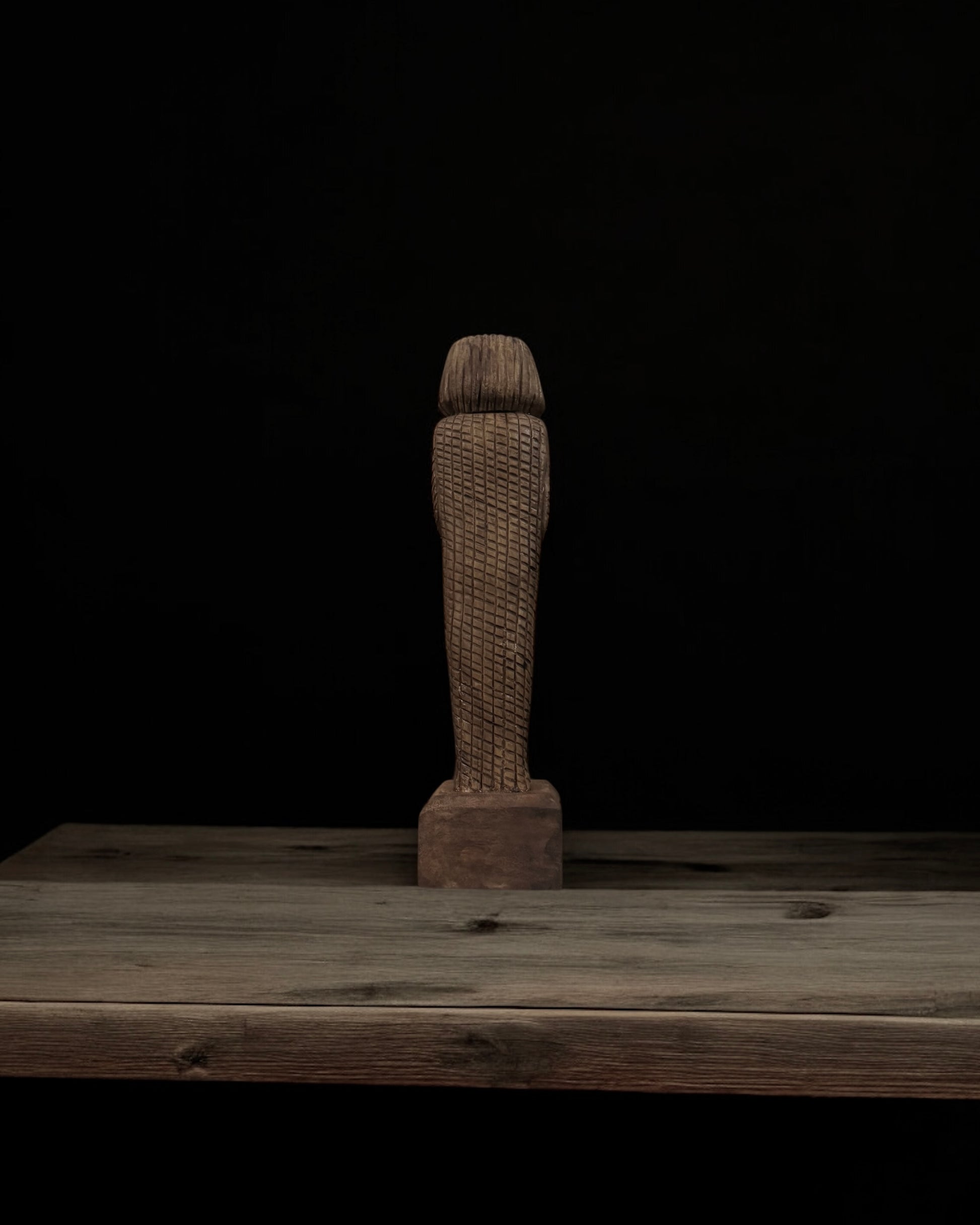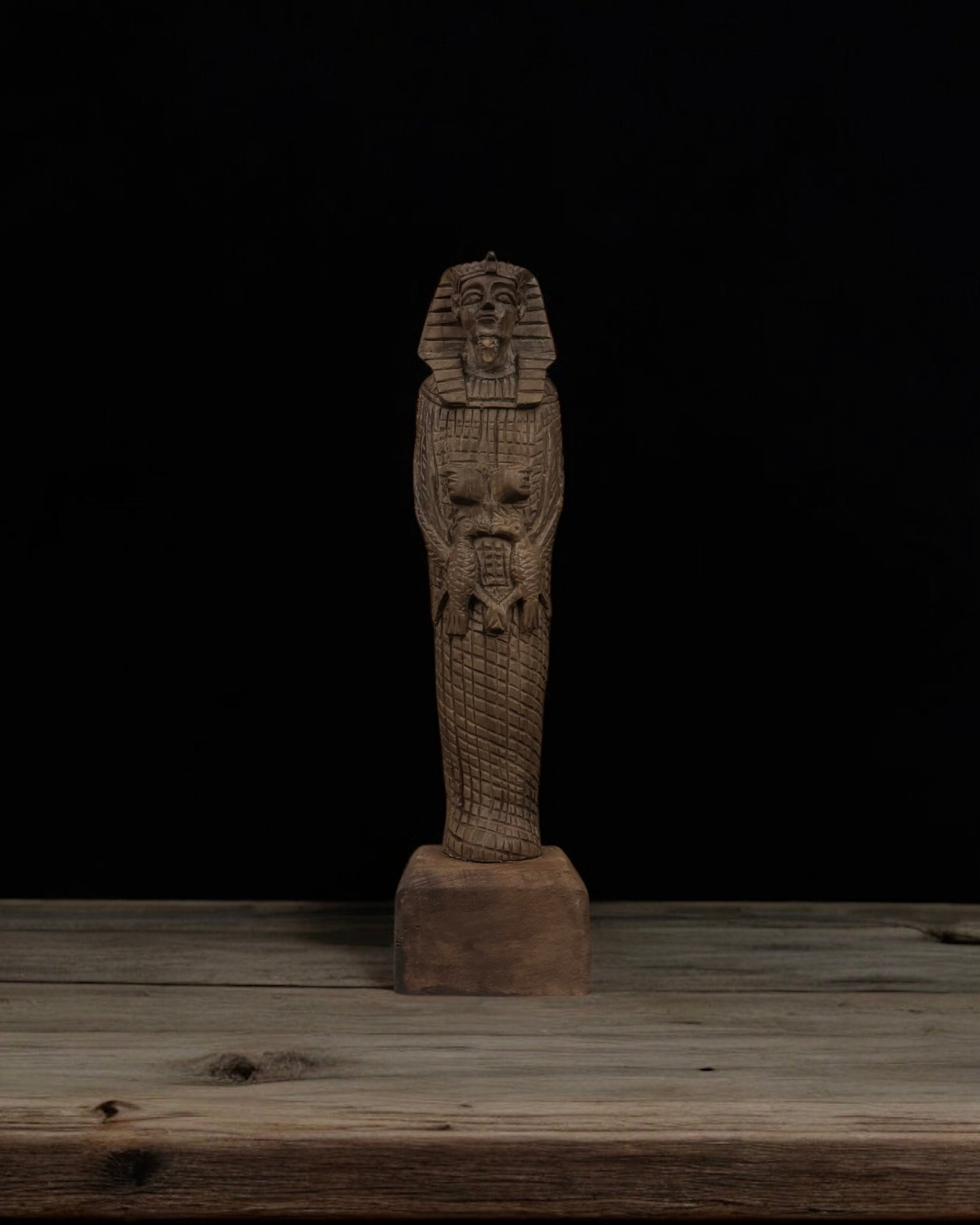 An exceptional and uncommon Egyptian figure, finely hand-carved in wood. Depicting a pharaoh in mummified form, the figure wears the traditional striped headdress and mask, emphasizing its royal and sacred character. Wooden Egyptian figures are rare compared to their stone or resin counterparts.