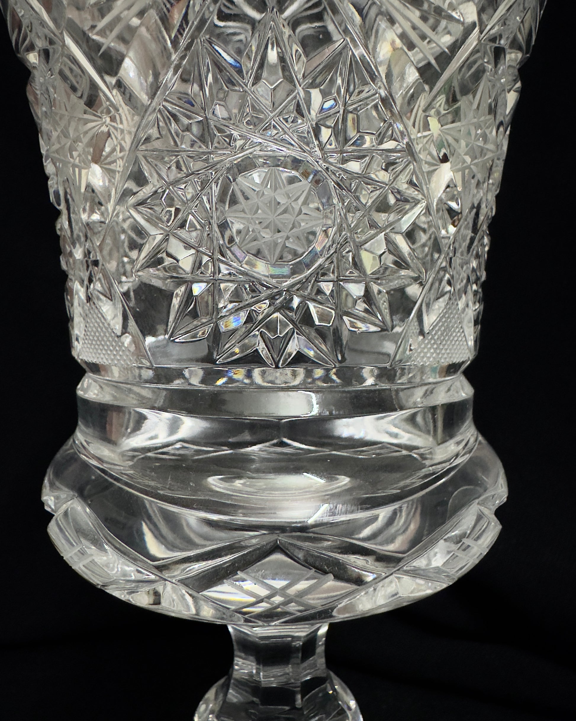 This striking vessel reminiscent of a refined lidded urn or display vase features exceptionally intricate and sharp cuts that catch the light beautifully from every angle. The tall, faceted pedestal base and matching cut-crystal lid give it a graceful, elevated presence, making it a perfect statement piece for any interior.