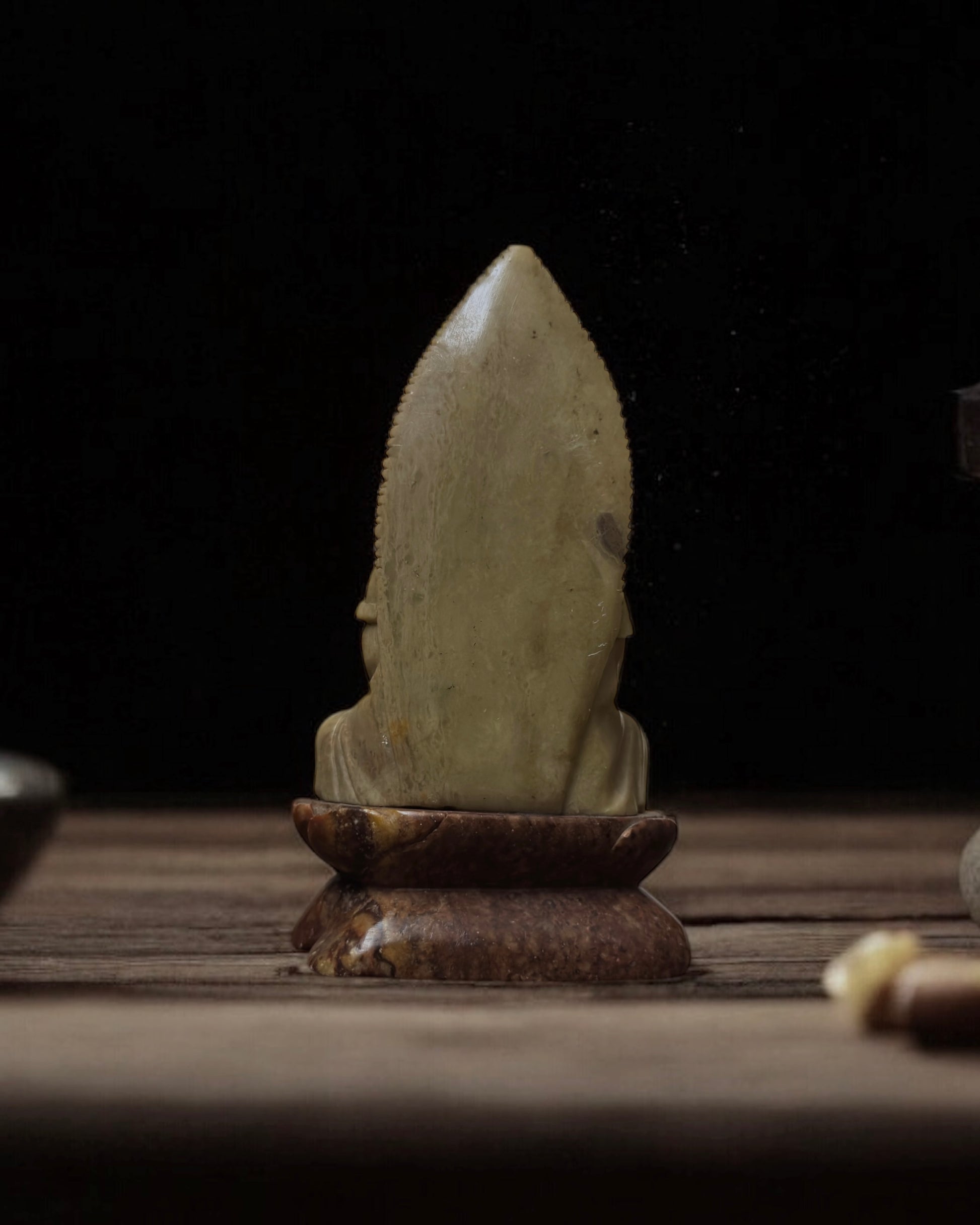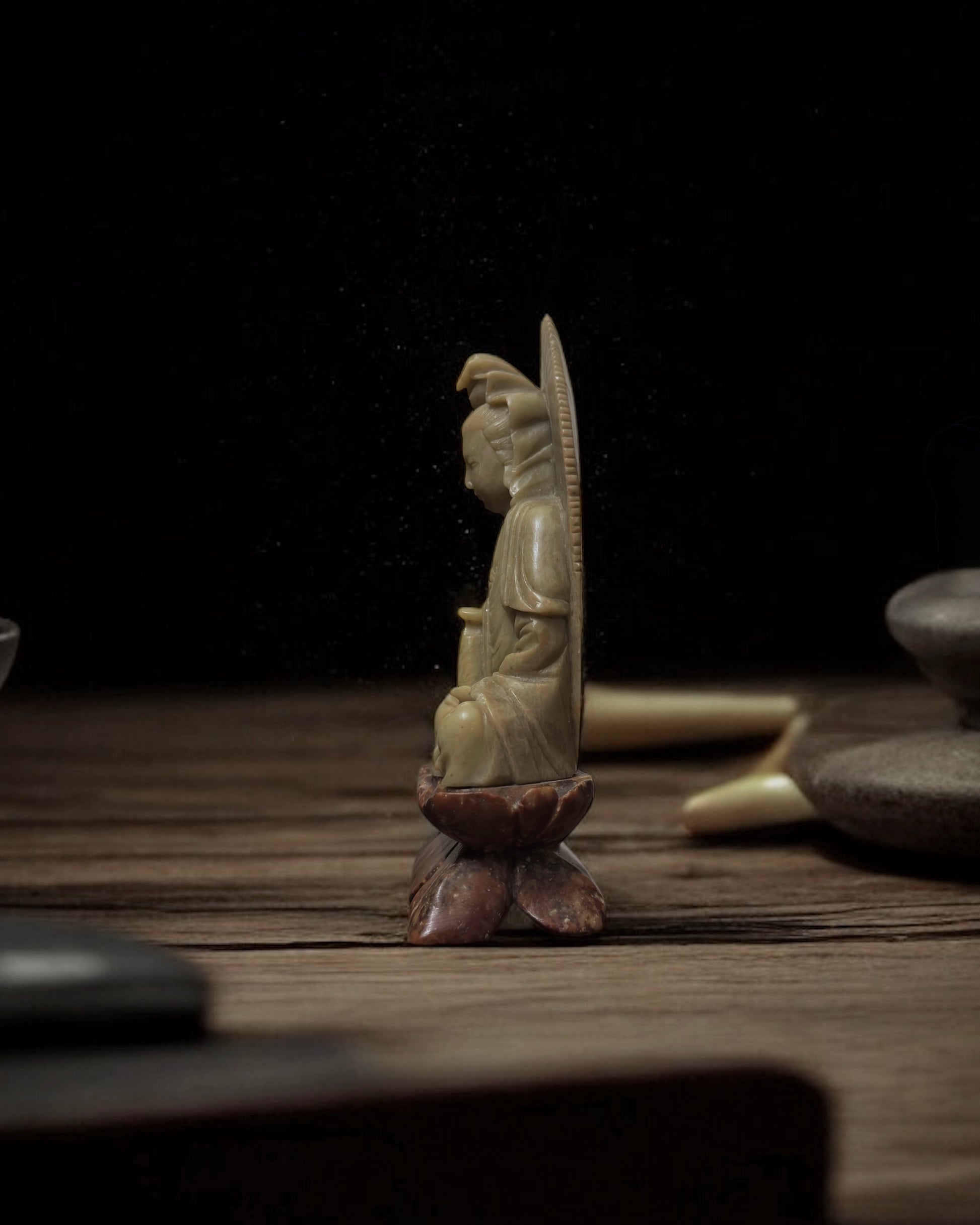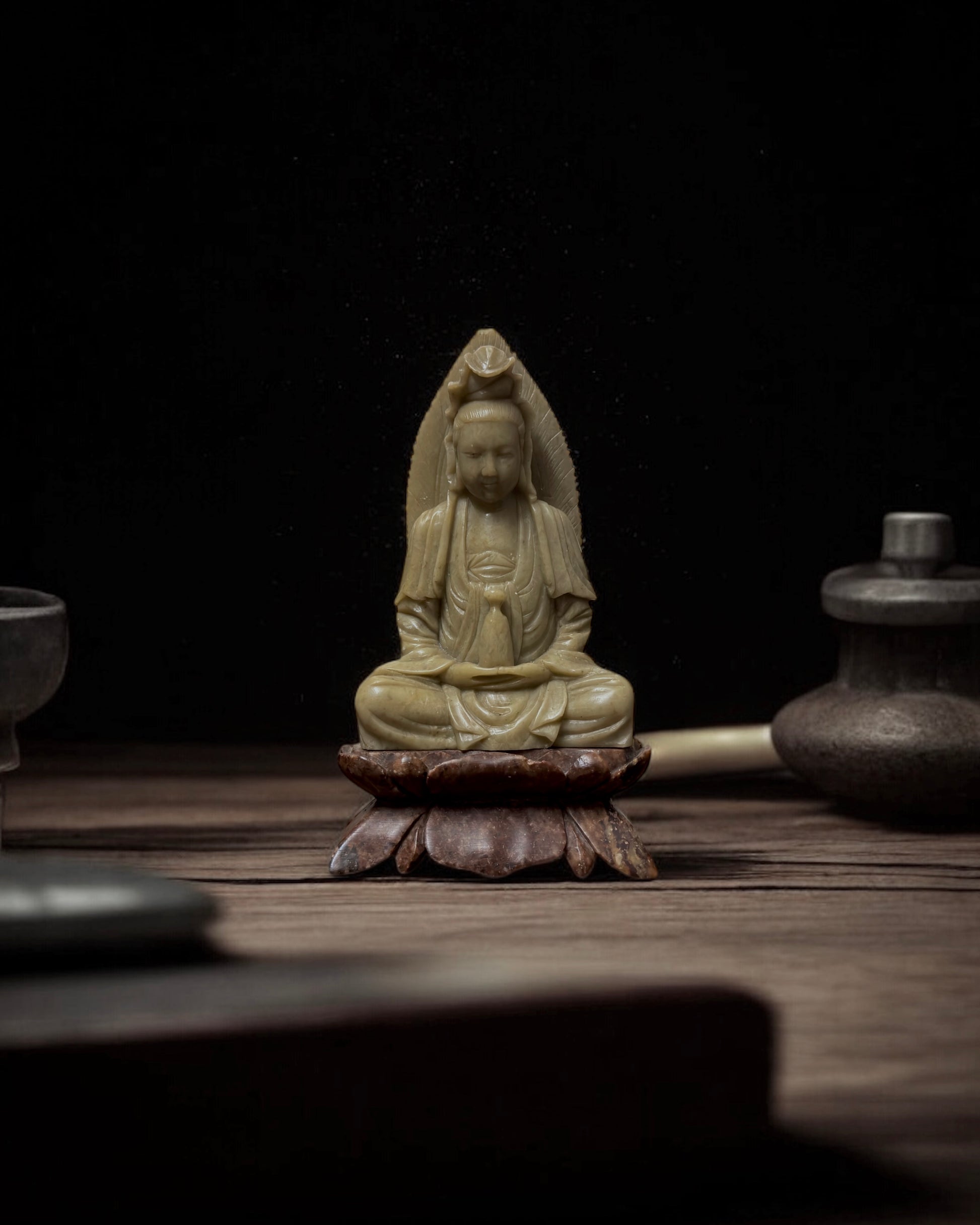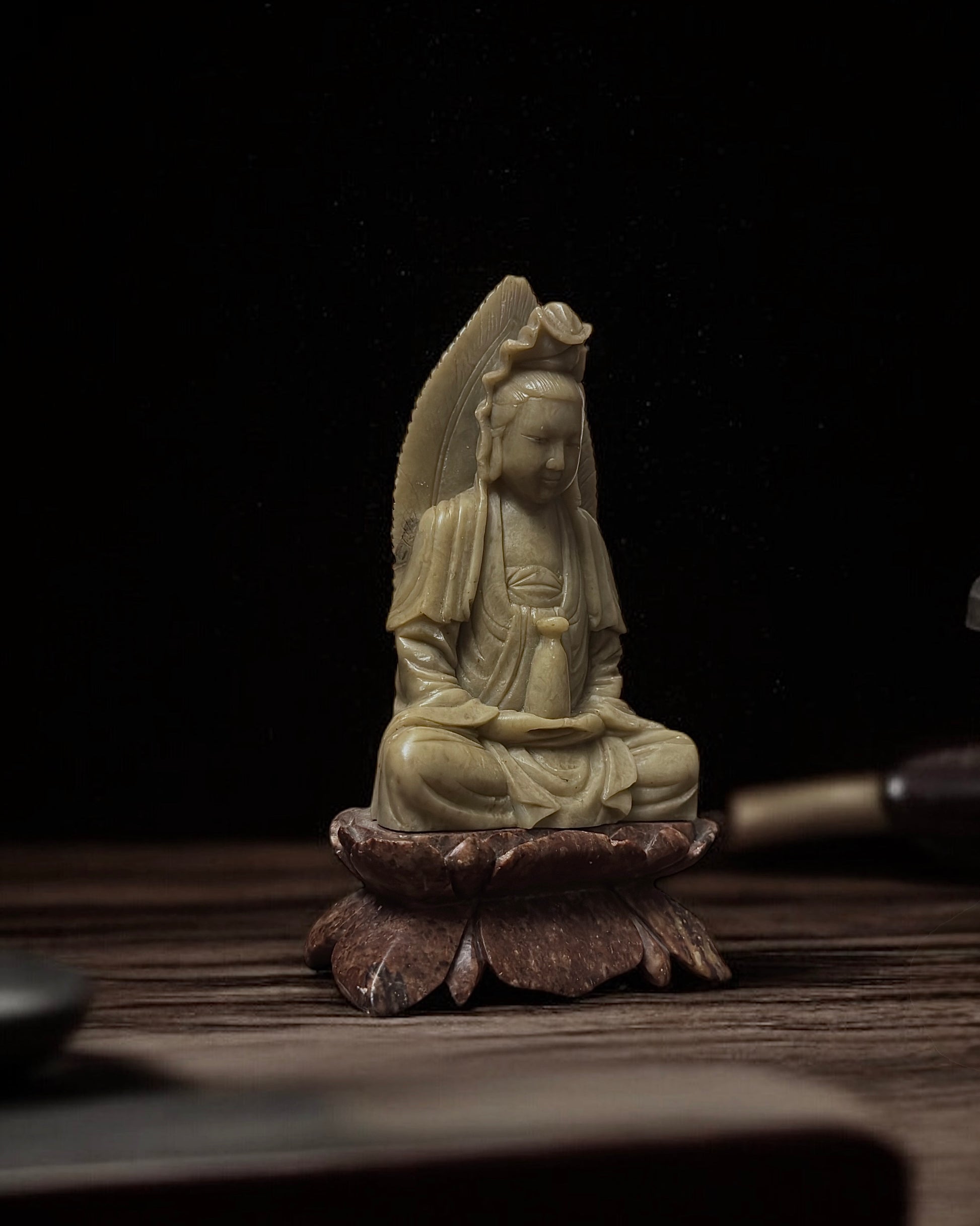 The piece reflects the enduring Chinese reverence for Guanyin as the embodiment of kindness and spiritual grace. The natural tone of the stone and delicate workmanship evoke a sense of quiet devotion, characteristic of mid 20th-century artisanship inspired by classical forms.