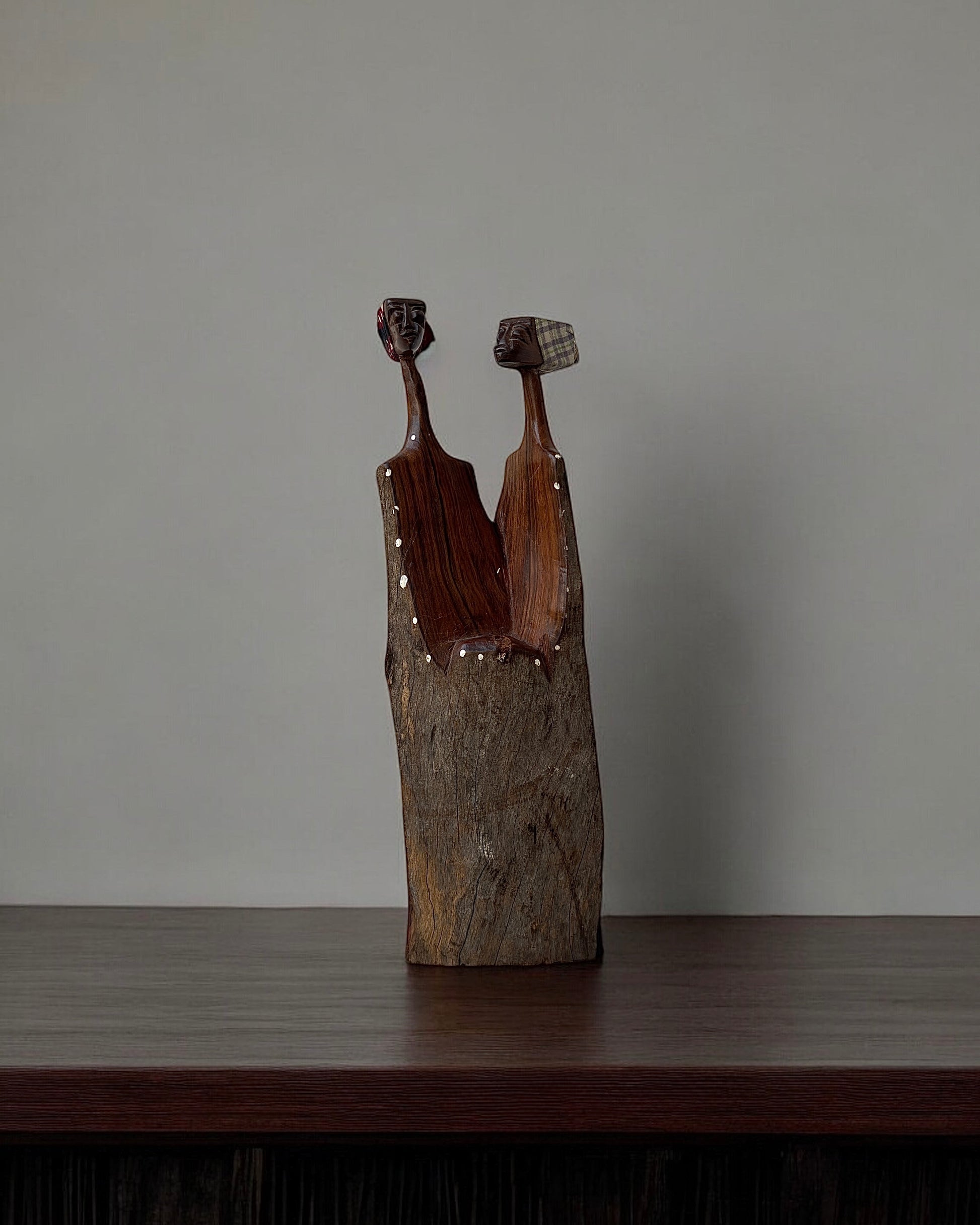 This hand-carved African sculpture draws inspiration from the renowned Makonde tribe of Tanzania and Mozambique, known for their expressive woodwork and elongated, symbolic figures. Crafted from a single piece of natural wood, the piece blends a raw, organic base with smoothly refined forms, depicting two figures that embody unity, connection, and the ancestral artistry of the Makonde tradition.