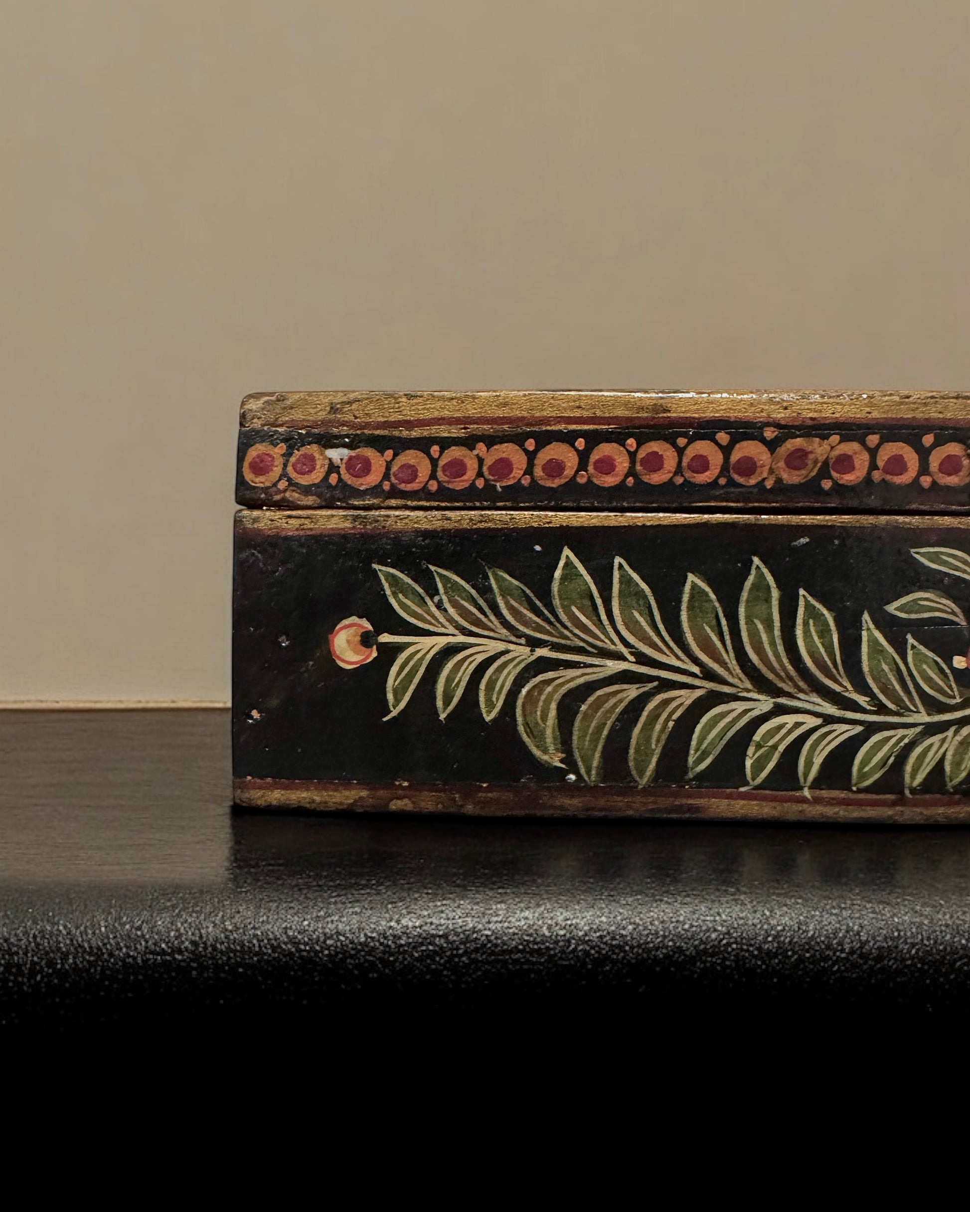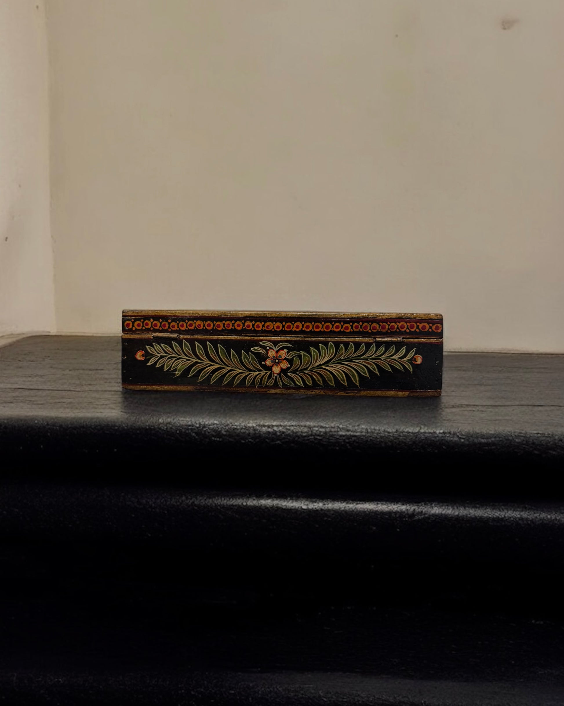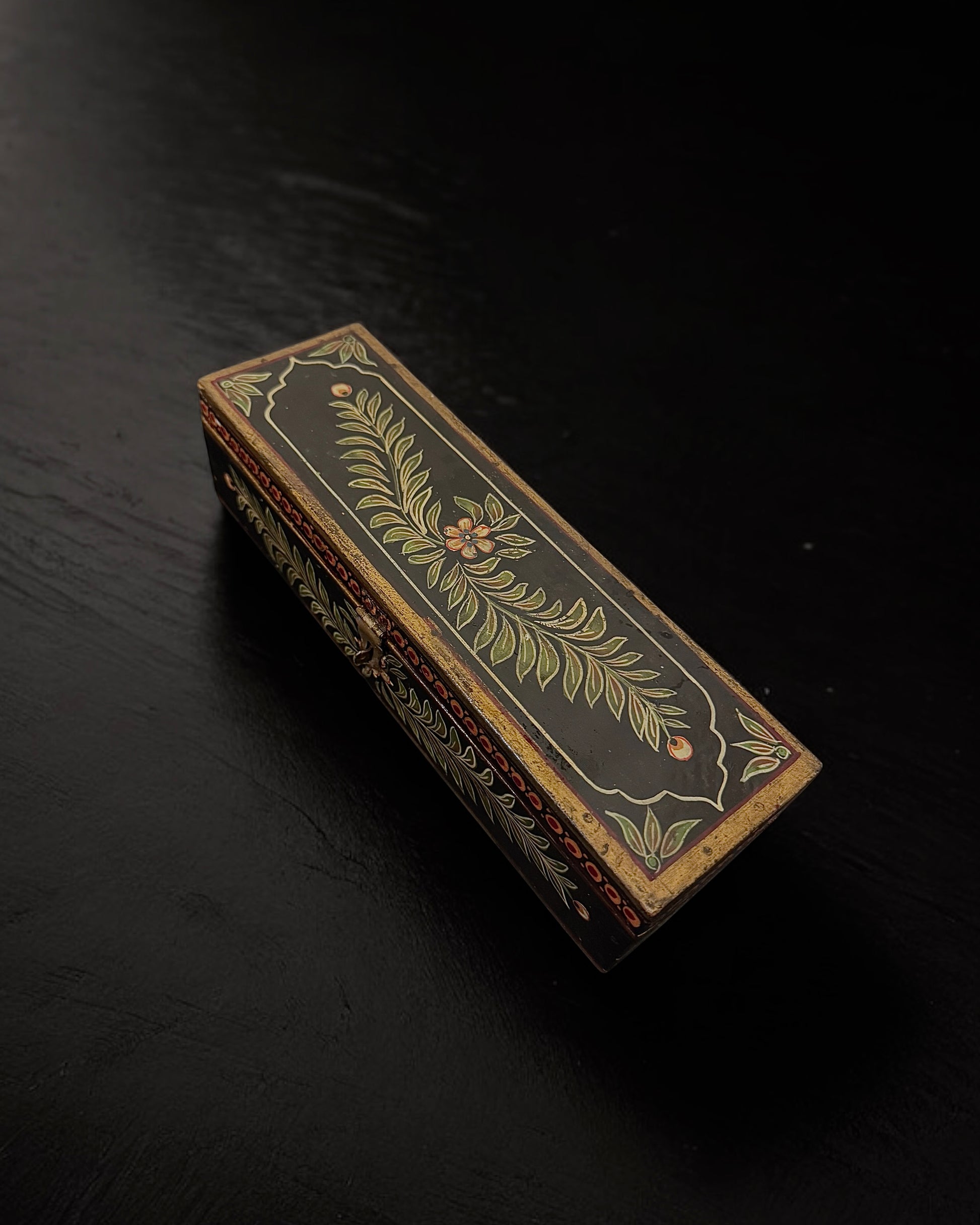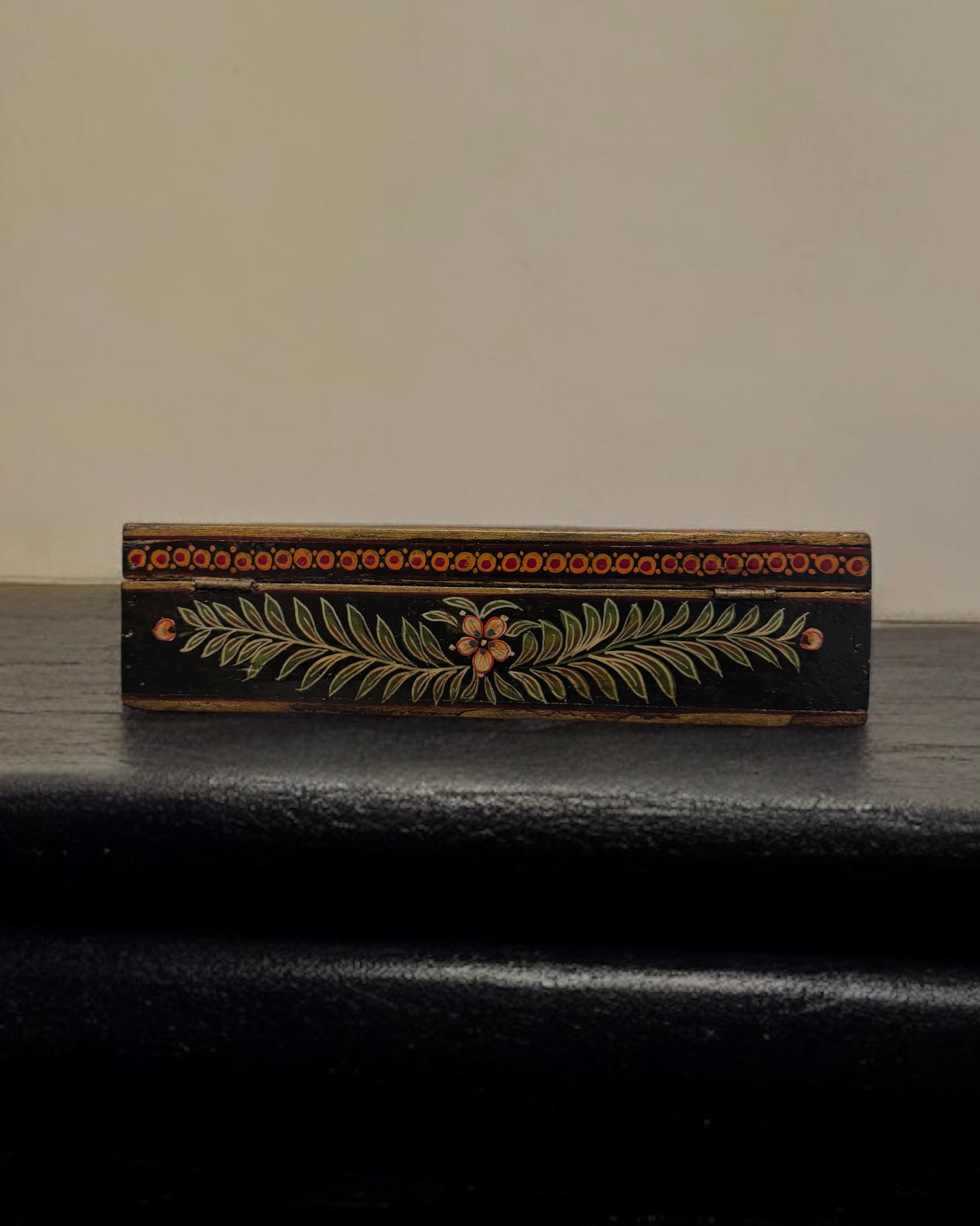 An old handmade folk art wooden qalamdan, likely of Indian or Persian origin. Hand painted with vibrant colours, intricate traditional motifs, and finished with a high-gloss glaze, it was originally used to store qalam pens and an ink pot. Today, it stands as a unique and eye catching decorative piece that reflects the rich craftsmanship of its time.