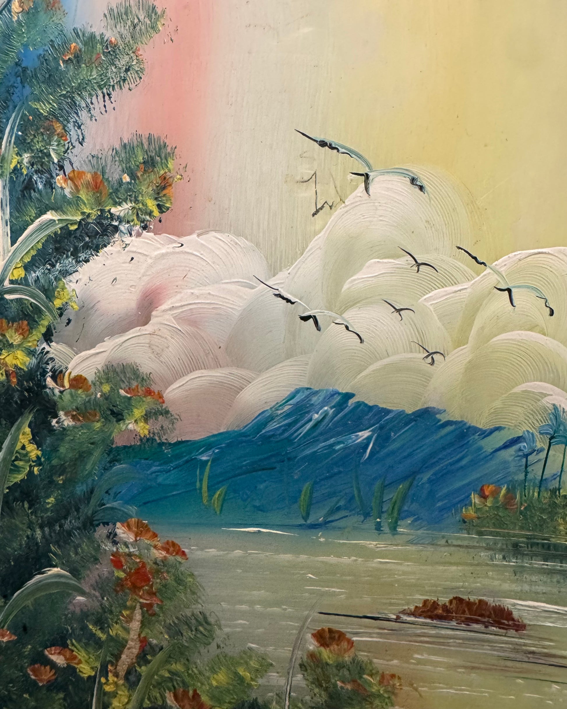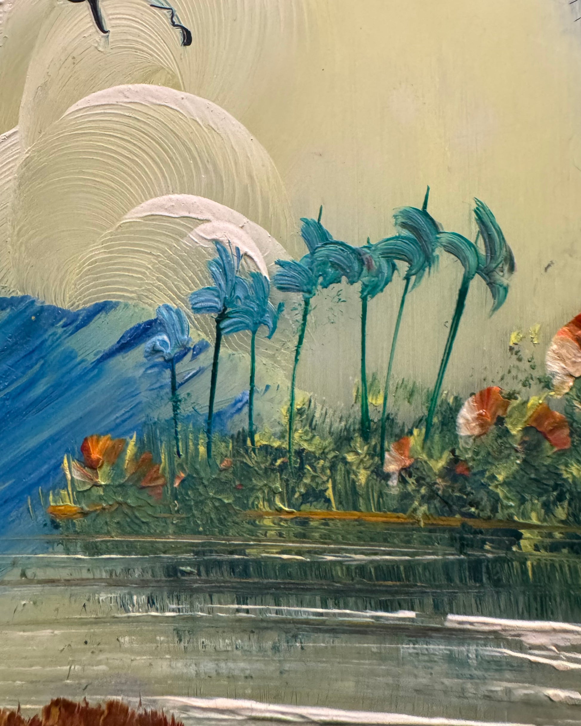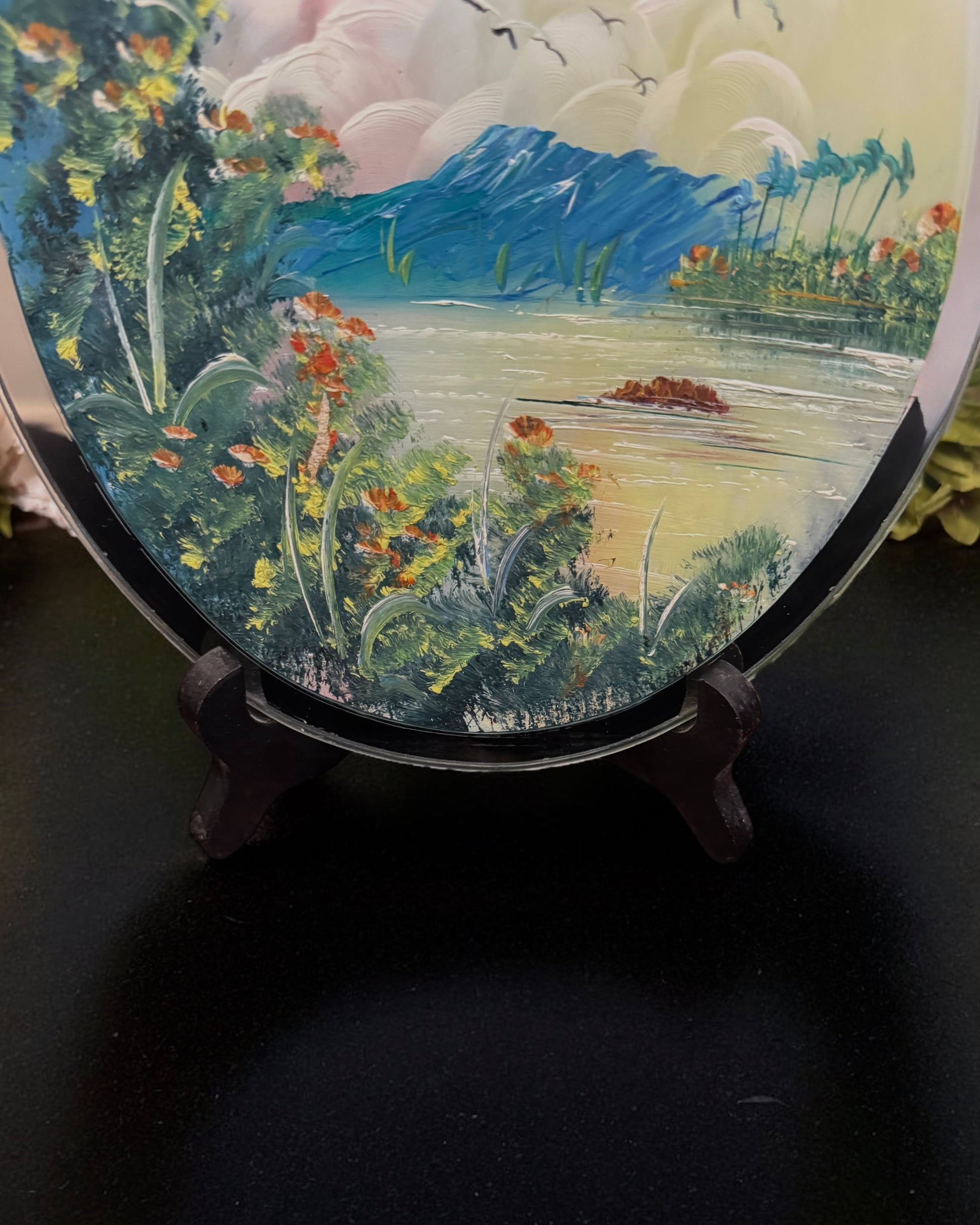 This exquisite vintage artwork captures the radiant beauty of Tenerife, the largest of Spain’s Canary Islands, known for its volcanic landscapes, lush greenery, and year round sunshine. Hand-painted on a mirror, the scene depicts a tranquil island landscape filled with vibrant colors, rolling hills, tropical foliage, and shimmering water beneath a softly glowing sky.