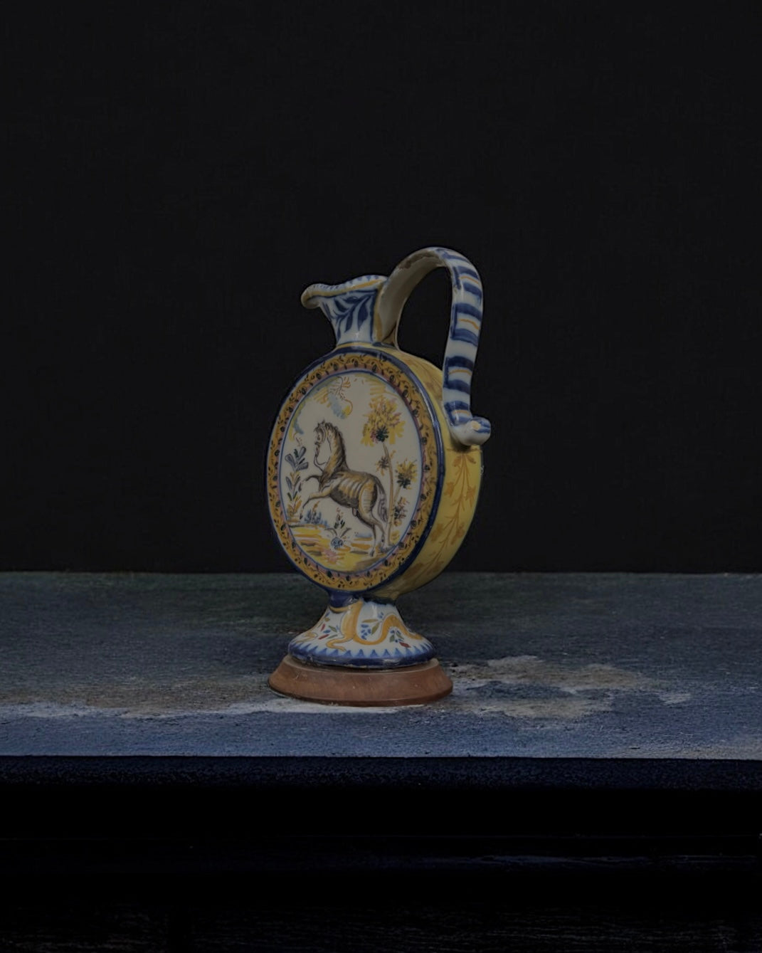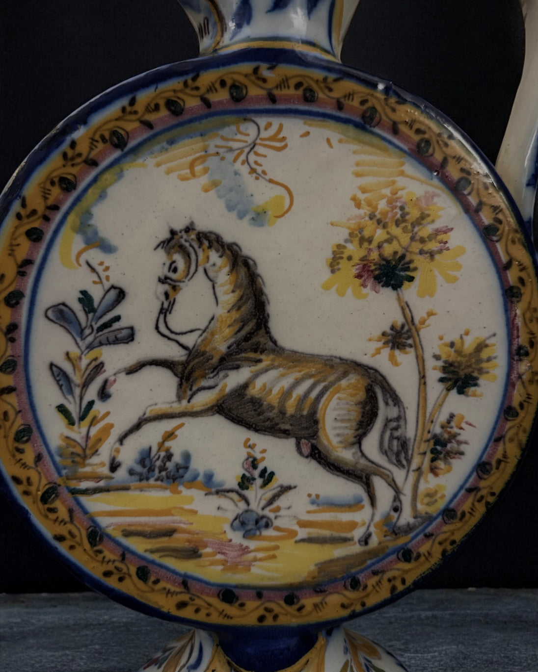 An extremely rare and collectible hand-painted majolica ewer from the famed Triana district of Seville, Spain, signed “Triana” beneath the spout. The flattened circular body is decorated with two distinct scenes: one side featuring a prancing horse, the other depicting a soldier in traditional dress. Both are framed within bold foliate borders in a vibrant palette of cobalt blue and other vivid colours . The neck and foot carry scrolling floral motifs, and the piece is mounted on a later wooden display base.