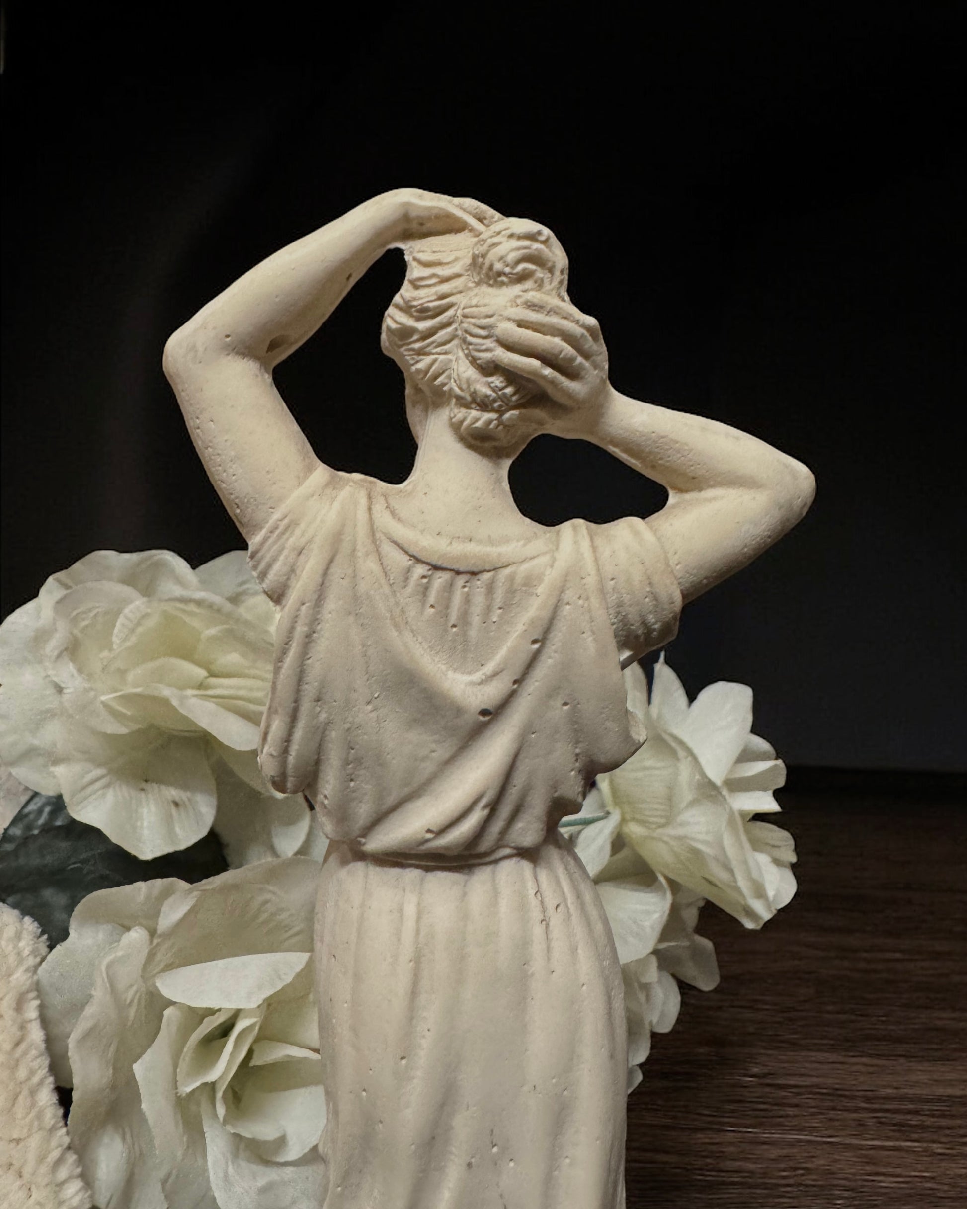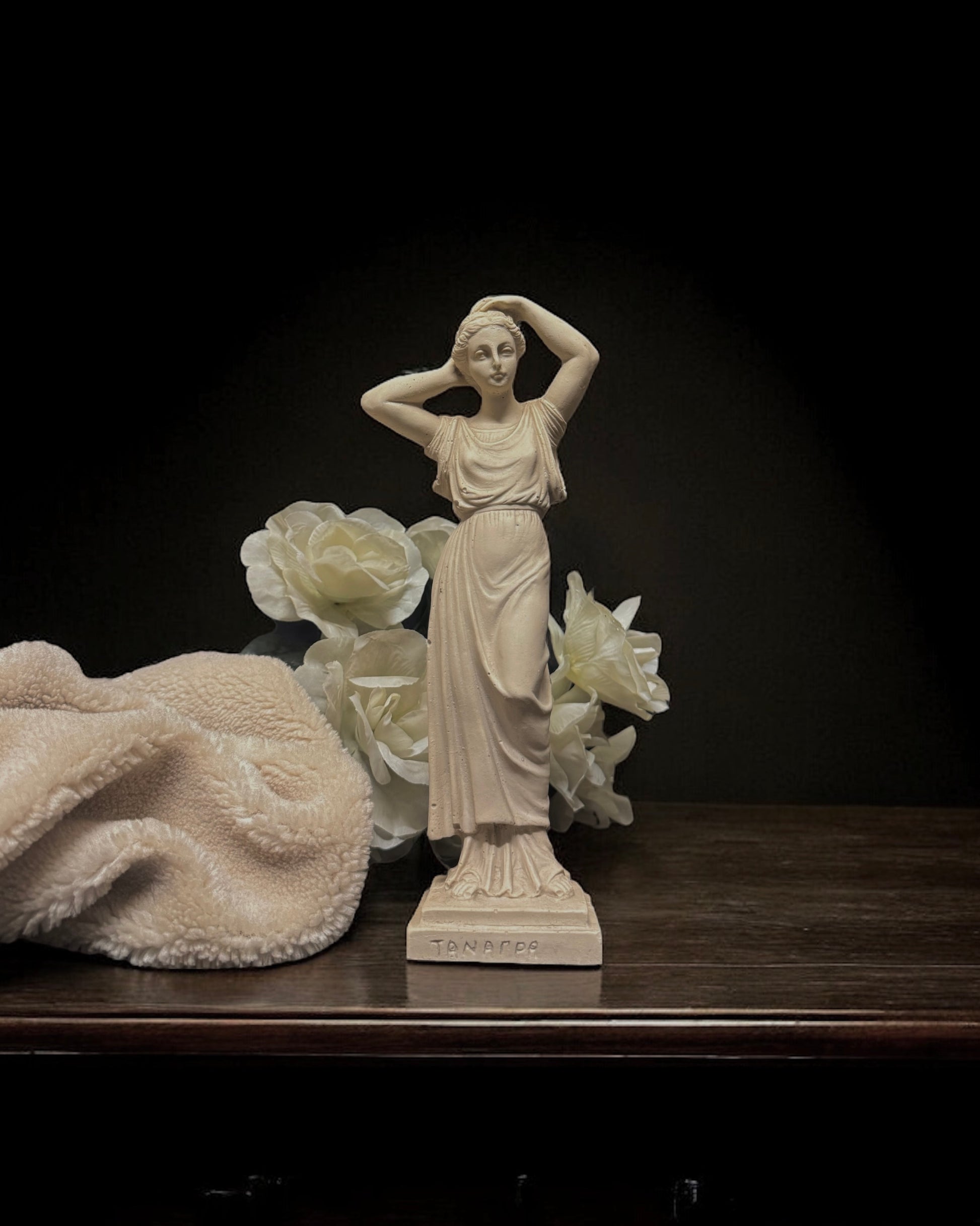 Beautifully crafted alabaster figurine depicting Venus Victrix, the goddess of love and victory. Marked “Tanarpa,” likely the name of the mid-century Greek maker inspired by the classical Tanagra style. Features fine detailing and elegant form, showcasing timeless Greco-Roman artistry.
