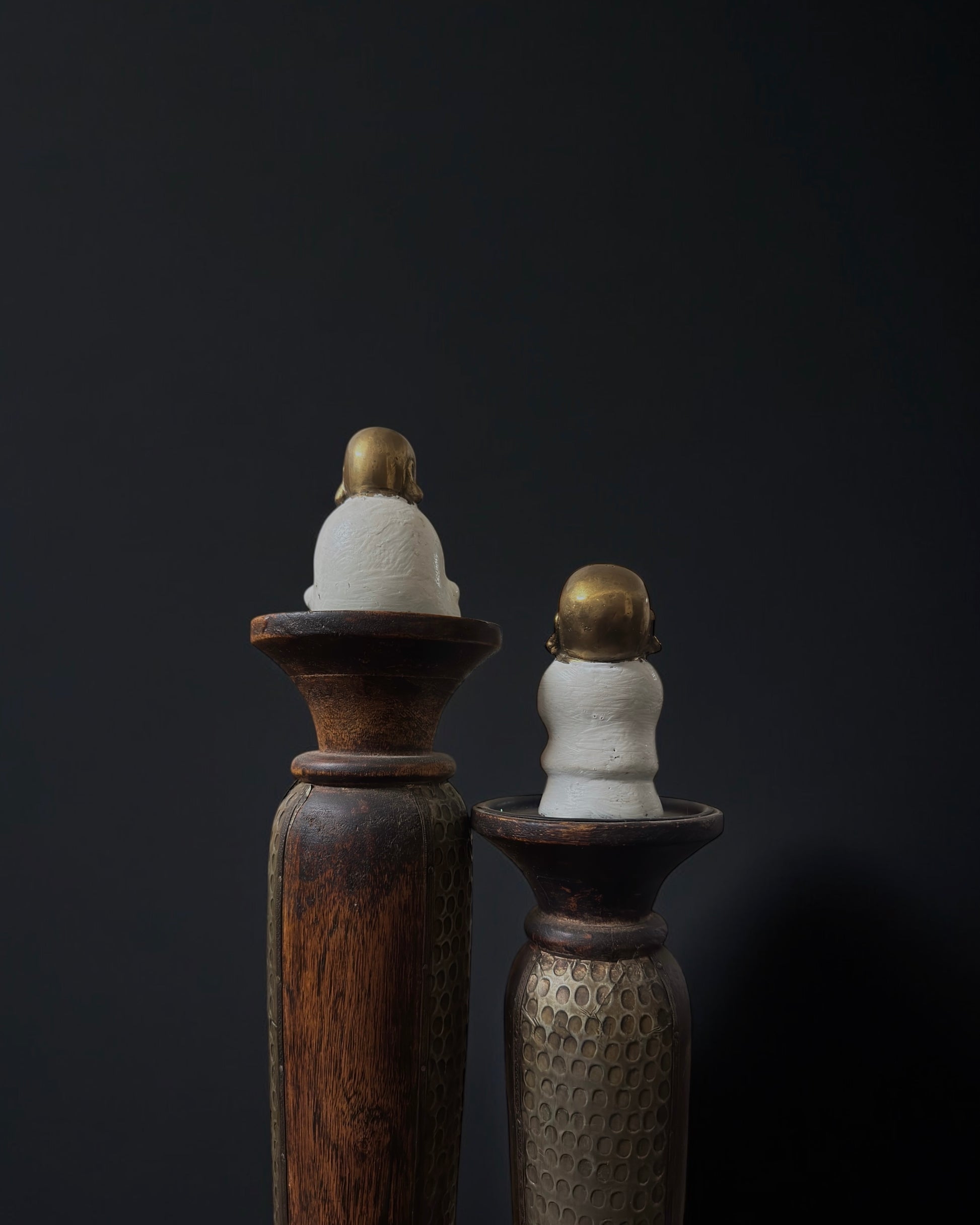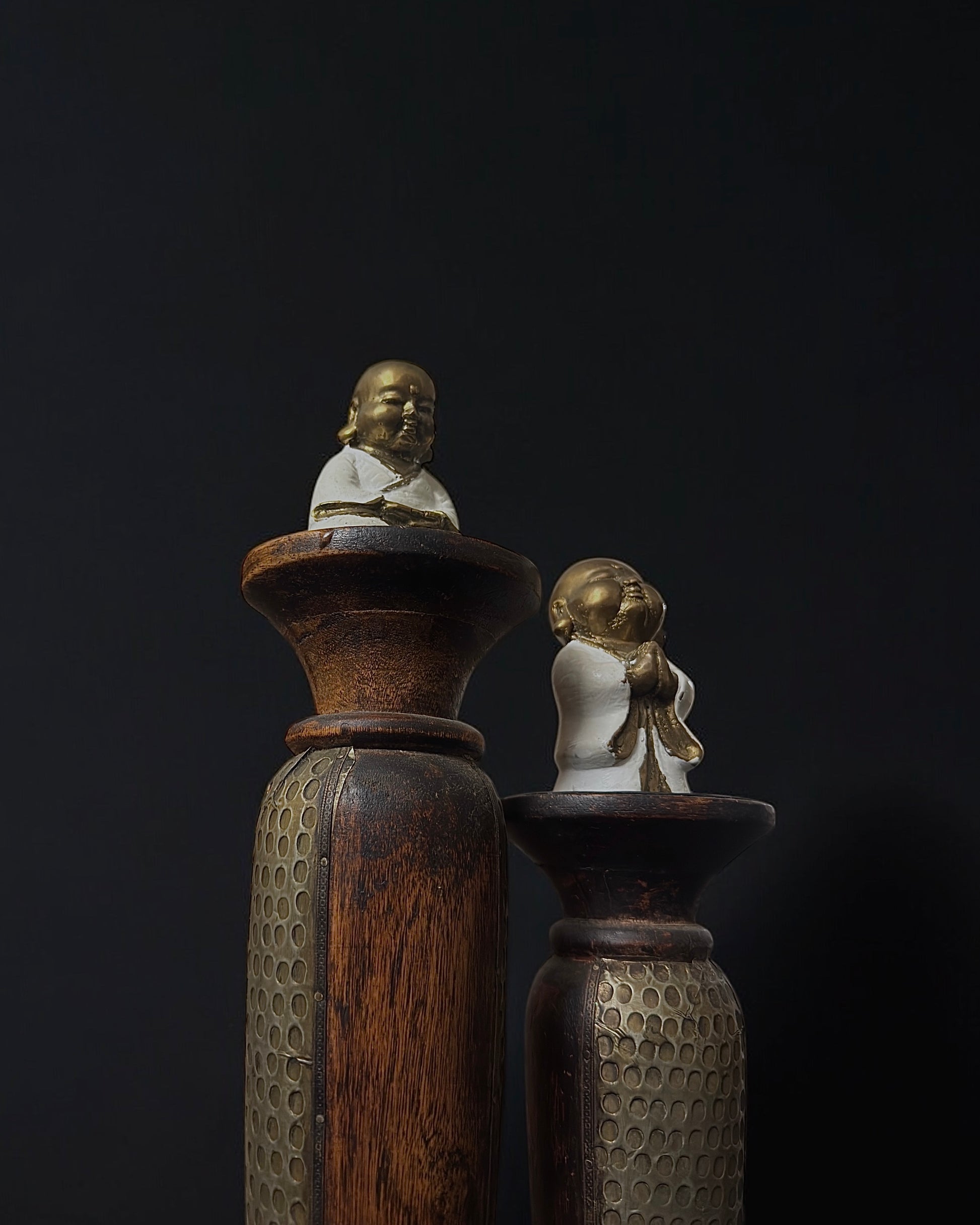 A beautiful pair of vintage Chinese Buddha figurines crafted from brass and finished with white enamel paint. Each piece depicts a happy, serene Buddha in peaceful poses, radiating calm and positivity. Their unusual and unique design highlights a harmonious blend of materials and artistry, making them very decorative and collectible pieces.