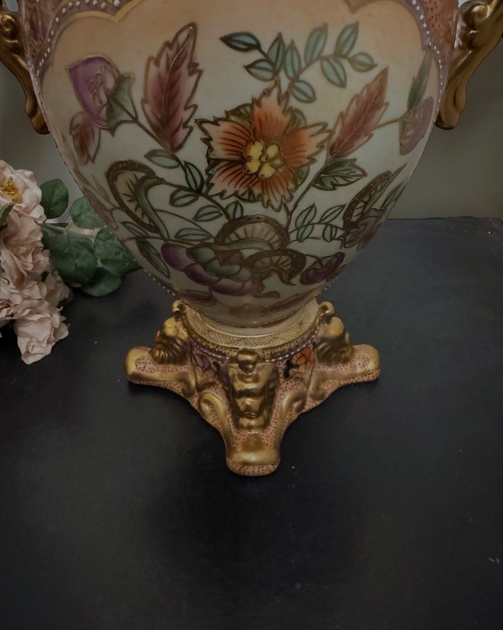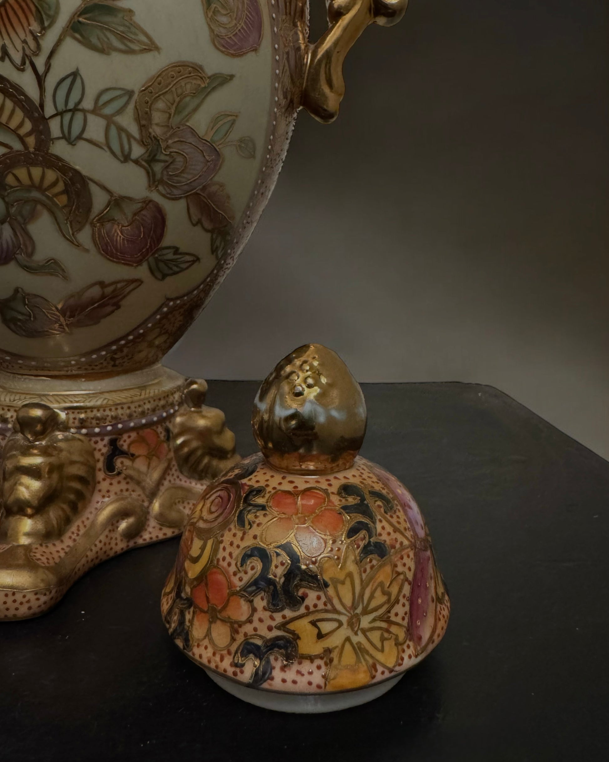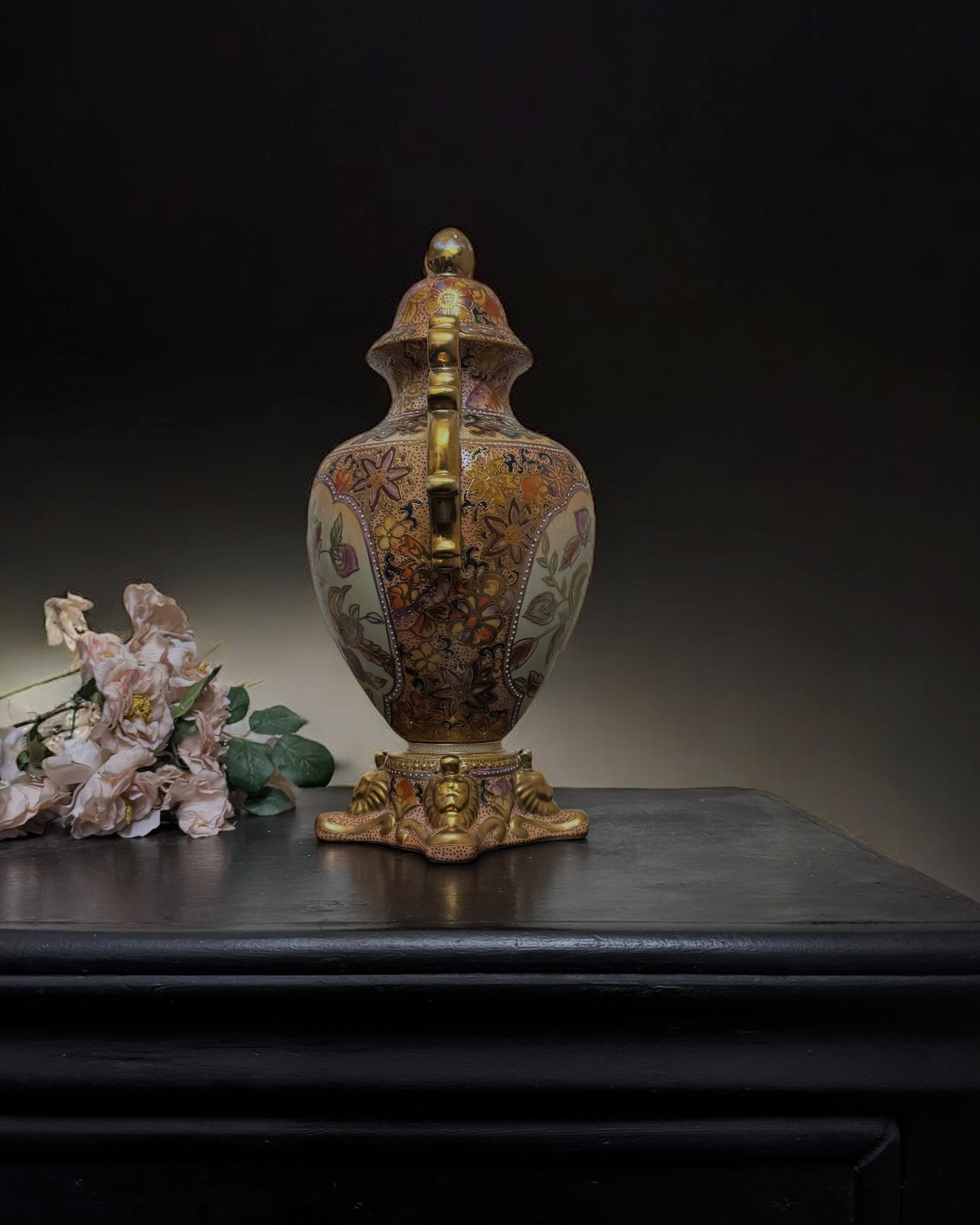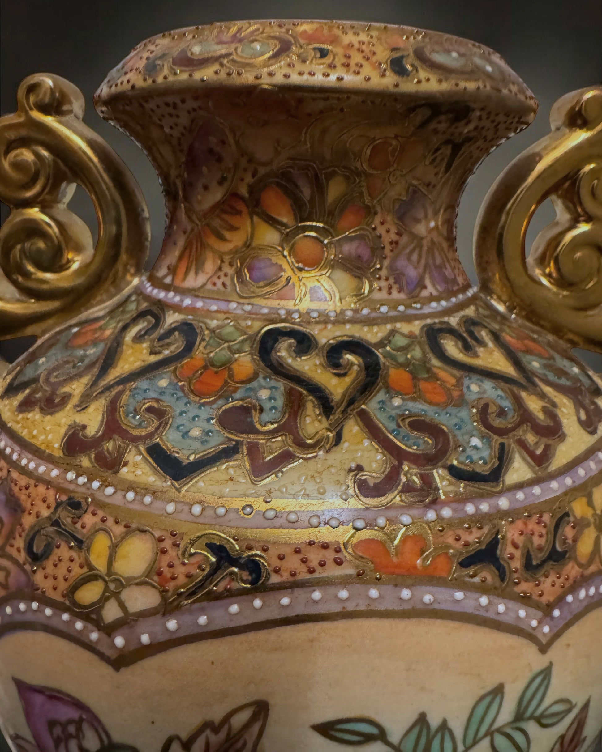 Hand-painted vintage Chinese porcelain urn, showcasing remarkable artistry and a rich, vibrant color palette. Every detail is applied by hand, with delicate golden highlights and a finely dotted, raised texture that adds depth, brilliance, and a luxurious feel to the surface. A striking decorative piece that radiates Asian craftsmanship.