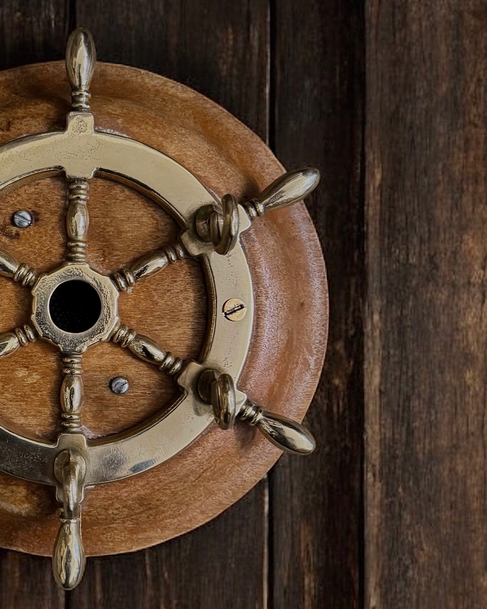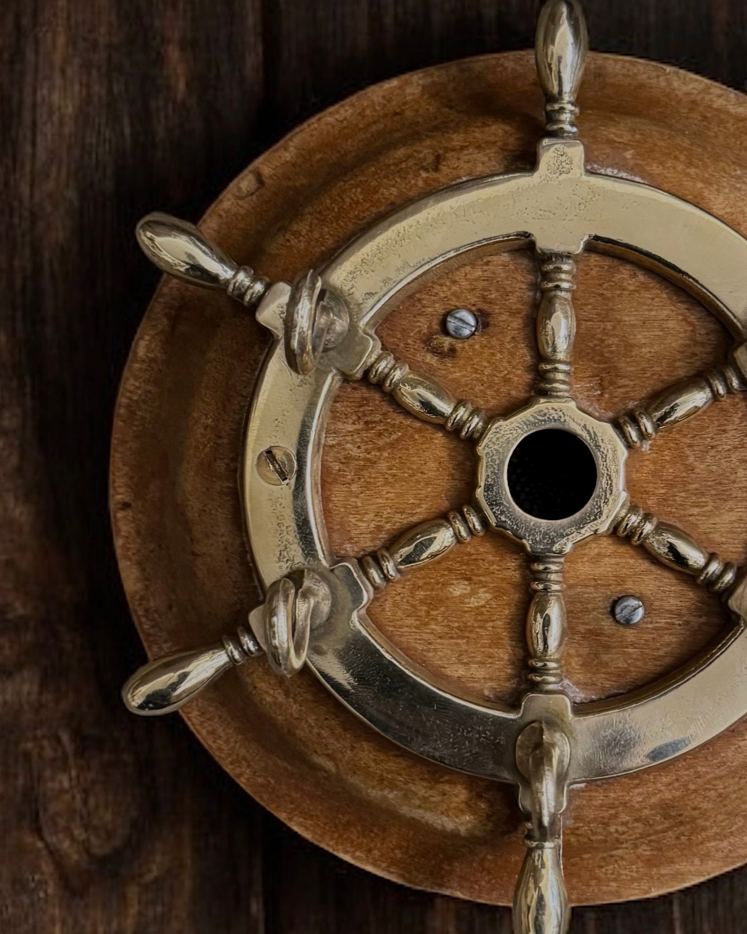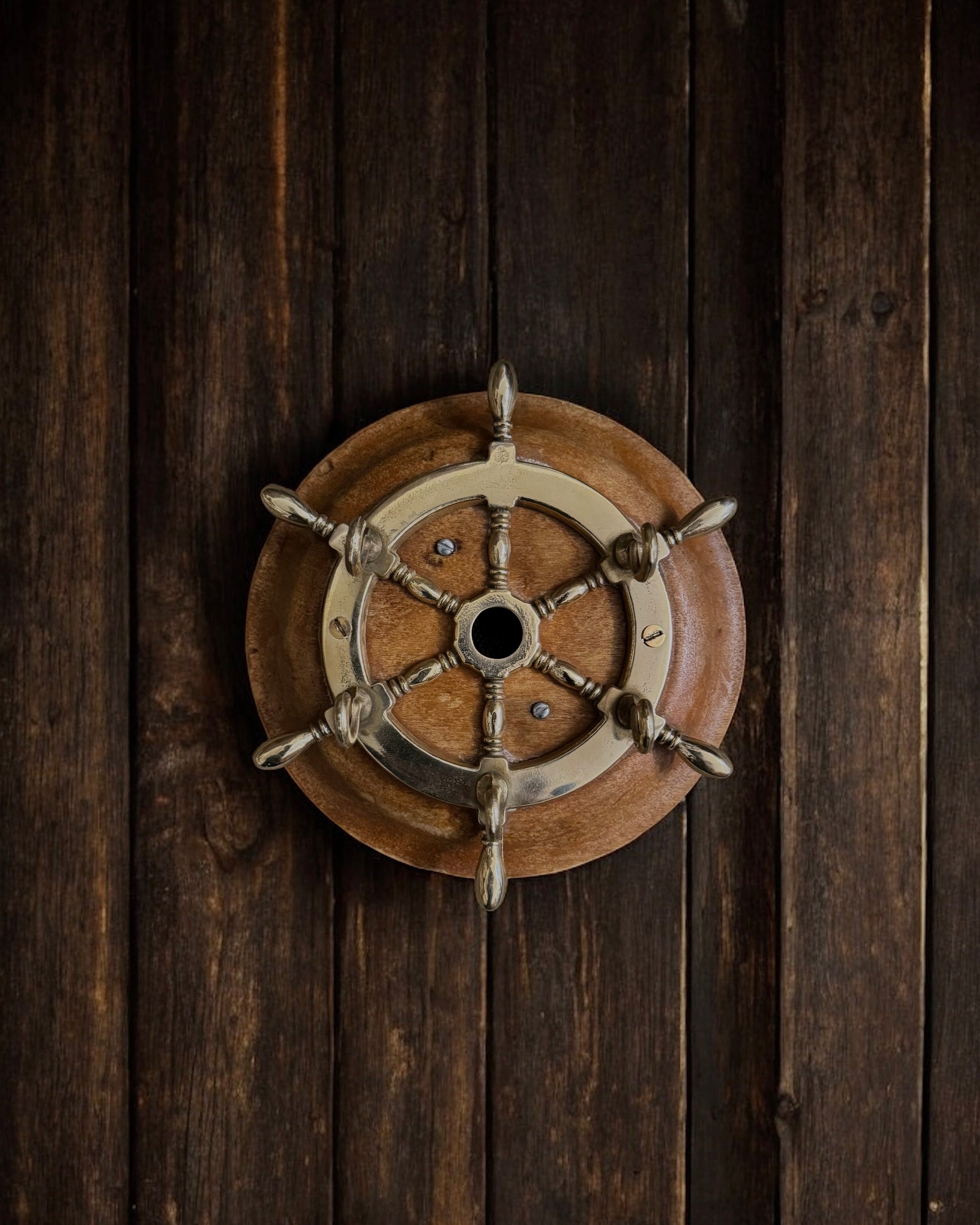 Elegant key holder from the European origin, featuring a classic ship wheel design, brass and wood construction, and five hooks for keys. A timeless nautical touch for any entryway.