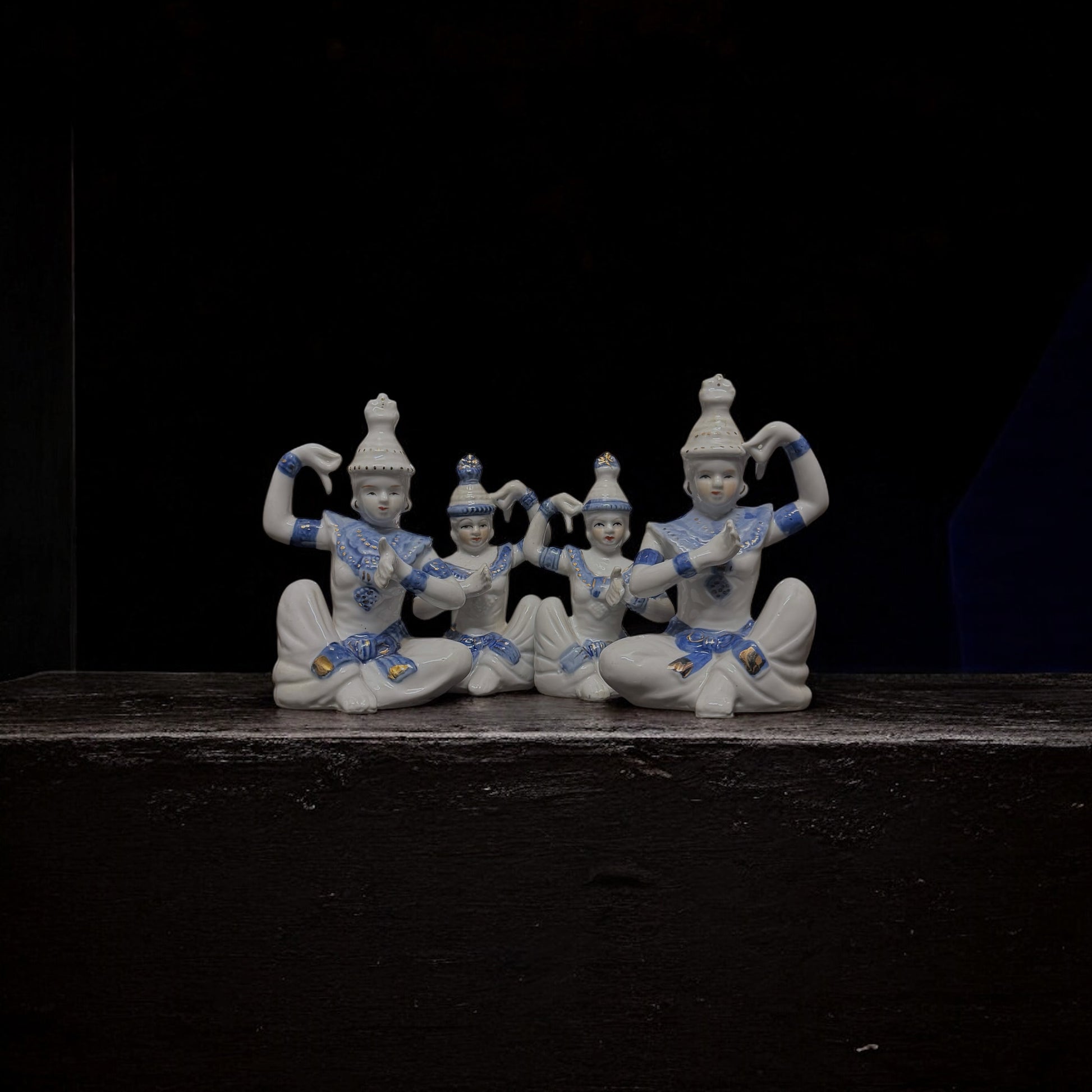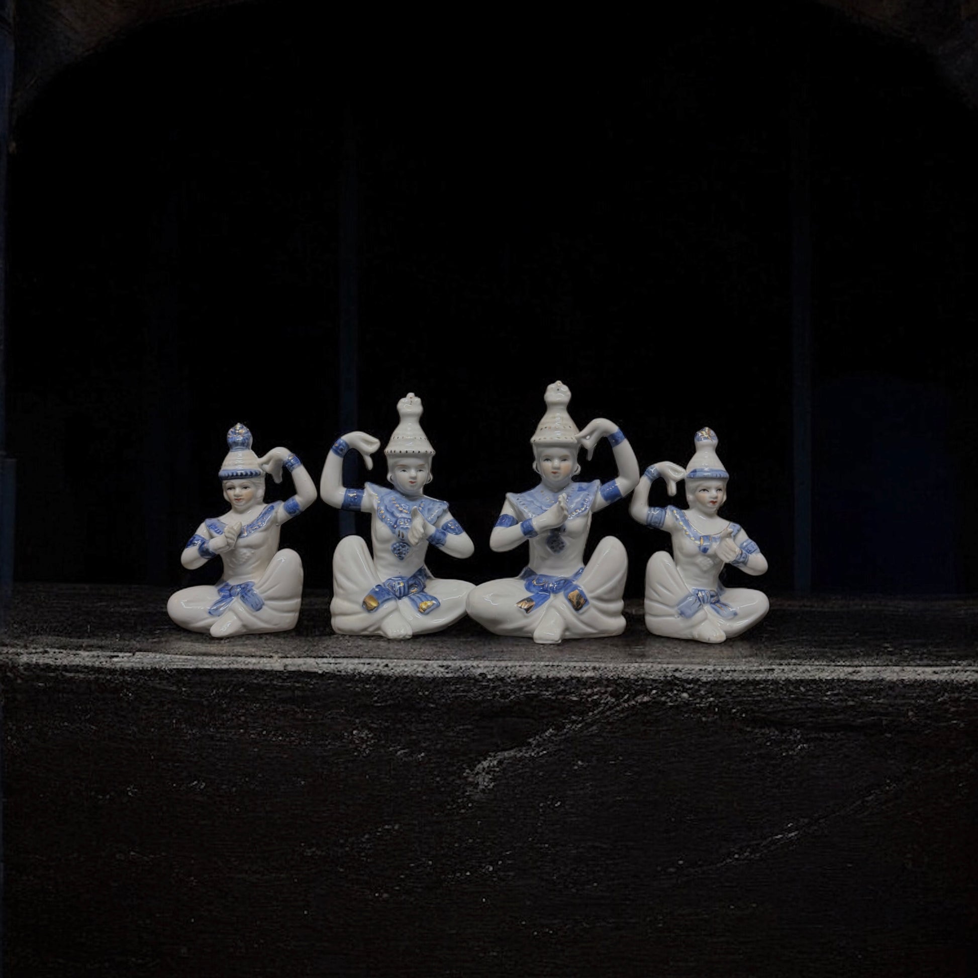 A charming vintage set of four porcelain figurines depicting Thai temple dancers in traditional costumes. Each piece shows careful detailing, from the tall headdresses to the blue and gold accents on their attire, with hand gestures that reflect classical Thai dance movements. Made with a smooth white glaze and subtle hand painted touches. Displayed together, the four figures create a balanced and eye catching group, making them a desirable addition for collectors of Asian porcelain or vintage decorative arts.